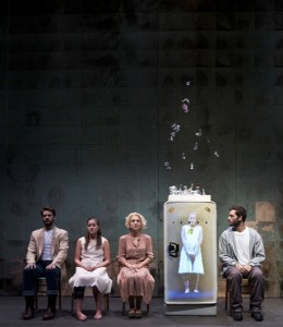 Εκτός από το πρωτότυπο κείμενο του έργου, στην παράσταση χρησιμοποιούνται και  μικρά αποσπάσματα από παλαιότερα σχεδιάσματα του συγγραφέα για το έργο, καθώς και από το διήγημα «Πορτρέτο κοριτσιού σε γυαλί», γραμμένο το 1943, που αποτελεί επίσης προσχέδιο για το έργο.