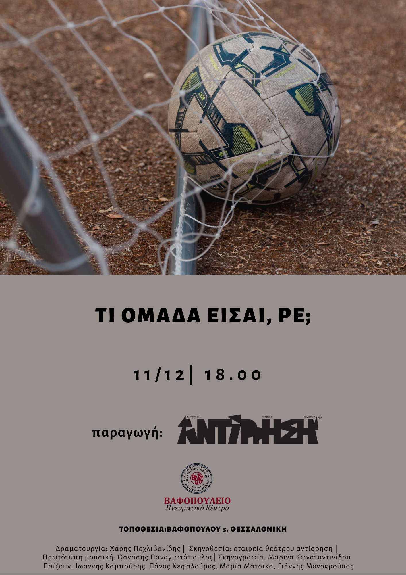 Η Αντίρρηση επιστρέφει στη Θεσσαλονίκη με δύο παραστάσεις την ίδια μέρα Πέμπτη 11 Δεκεμβρίου | Βαφοπούλειο Πνευματικό Κέντρο (Βαφόπουλου 5) 18:00 – «Τι Ομάδα Είσαι, ρε;» 20:00 – «Δημοπρασίες Φιλοσόφων» Η Εταιρεία Θεάτρου Αντίρρηση παρουσιάζει δύο ξεχωριστές προτάσεις που ανοίγουν διάλογο με το σήμερα: ένα θέατρο-ντοκουμέντο για την οπαδική κουλτούρα και μία σατιρική «αγορά» ιδεών […]