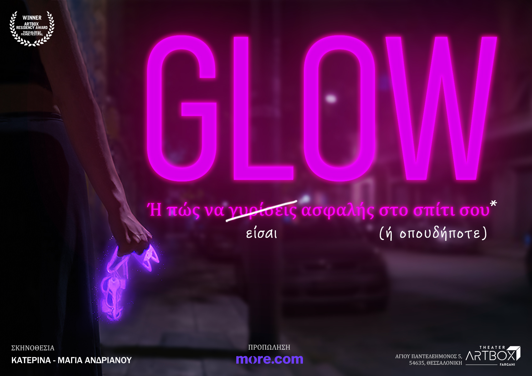 ΘΕΑΤΡΟ ARTBOX FARGANI«GLOW ή Πώς να γυρίσεις ασφαλής στο σπίτι σου» Η βραβευμένη στο Thessaloniki Fringe Festival παράσταση ΕΠΙΣΤΡΕΦΕΙ ΓΙΑ 2 ΜΟΝΑΔΙΚΕΣ ΠΑΡΑΣΤΑΣΕΙΣ στο ARTBOX FARGANI Δευτέρα 16 & Τρίτη 17 Μαρτίου στις 9:00 μ.μ.