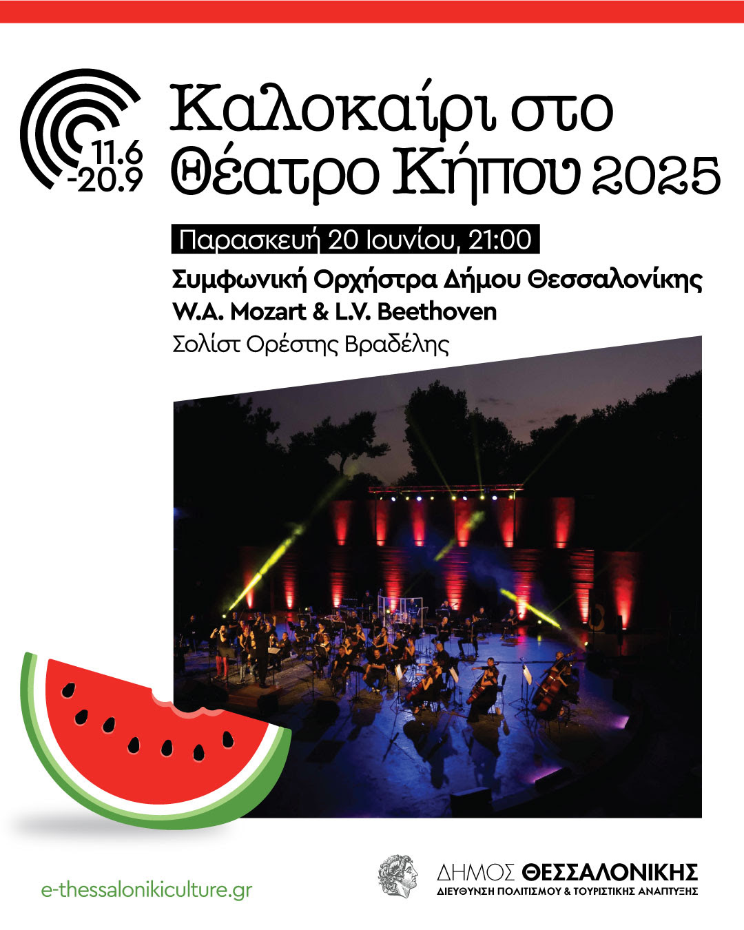 «Φεστιβάλ Καλοκαίρι στο Θέατρο Κήπου» Γιορτάζουμε την Ευρωπαϊκή Ημέρα Μουσικής με τη Συμφωνική Ορχήστρα Δήμου Θεσσαλονίκης Παρασκευή 20 Ιουνίου 2025 Η Συμφωνική Ορχήστρα Δήμου Θεσσαλονίκης προσκαλείται σε μια μαγευτική βραδιά με δύο μεγάλα έργα της κλασικής μουσικής: Μότσαρτ και Μπετόβεν! Το πρόγραμμα περιλαμβάνει την εντυπωσιακή εισαγωγή από τη «Μεγαλοψυχία του Τίτου», το κοντσέρτο για κόρνο […]